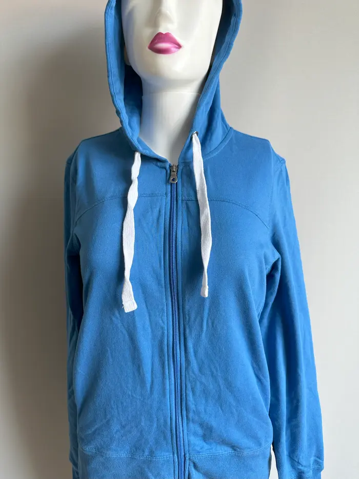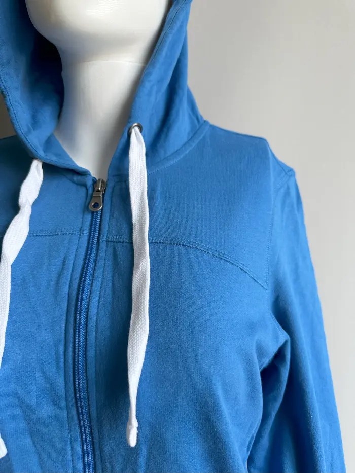 Un hanorac cu glugă, buzunare laterale și fermoar, de culoare albastră, pentru damă este o piesă vestimentară practică și modernă, ideală pentru un look casual sau sport. Gluga reglabilă cu șnur oferă protecție împotriva vântului și frigului, aducând în același timp un aer relaxat ținutei. Fermoarul frontal, care se întinde pe toată lungimea hanoracului, permite o îmbrăcare și o dezbrăcare rapidă, precum și ajustarea gradului de confort termic.